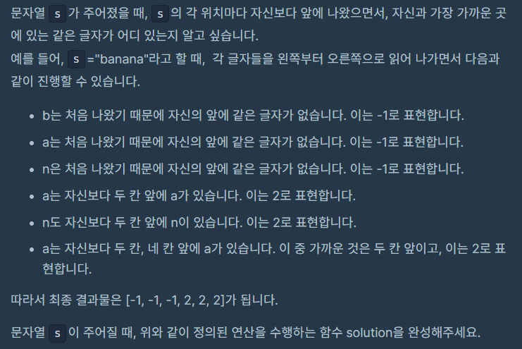 문제 설명 정답 class Solution { public int[] solution(String s) { int[] answer = new int[s.length()]; // 문자열의 길이만큼 반복 for(int i=0; i substring 메서드로 현재 문자열의 직전 문자열까지 추출한다. -> 추출한 문자열 중에서 현재 문자열의 lastIndex를 추출한다. -> 추출한 문자열 중에서 현재 문자열이 존재하지 않다면 -1을 index 변수에 저장한다. -> 존재한다면, 마지막 인덱스 번호를 index변수에 저장한다. -> index번호를 이용해서 (현재 문자열의 인덱스번호 - index(이전 문자열중 현재 문자열의 마지막 위치)) 의 값을 answer 배열에 넣어준다. 배운것 lastIndexOf( ..
